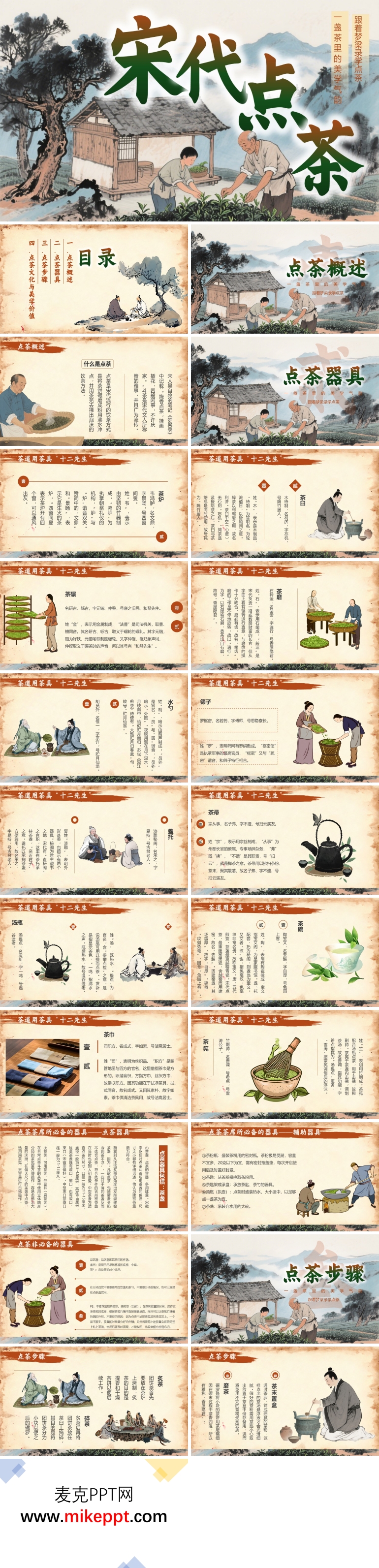 宋代點茶文化演示文稿,共 35 張幻燈片,生動展現了我國茶文化發展史上的璀璨篇章。宋代作為我國茶文化的鼎盛時期,點茶之風盛行,上至文人雅士揮毫潑墨間的品茗雅事,下至市井百姓街頭巷尾的日常茶飲,點茶成為當時最具代表性的時尚飲茶方式。在宋代,茶早已超越了單純飲品的范疇,成為一種獨特的文化象征。人們以茶會友,在裊裊茶香中交流思想、碰撞智慧,于品茶的過程中涵養心性、提升藝術修養。不僅如此,宋代點茶所蘊含的濃厚儀式感與沉浸式體驗感,對后世的飲茶習俗產生了深遠影響,其深厚的文化底蘊至今仍散發著迷人的魅力。? 這份演示文稿由四個部分構成,系統梳理了宋代點茶文化的脈絡與精髓。第一部分 “點茶步驟” 詳細拆解了點茶的完整流程,從炙茶開始,將茶餅用微火烘烤以激發茶香;隨后進行碎茶,把炙好的茶餅掰成小塊;接著是磨茶,將碎茶放入茶磨中研磨成細膩的茶粉;之后取粉,用篩子篩出精細的茶末;最后是注湯,向茶盞中注入沸水,并用茶筅攪拌出綿密的湯花。每一個步驟都蘊含著古人對飲茶的極致追求,展現了點茶技藝的精妙。? 第二部分 “點茶概述” 從理論層面解讀點茶文化。首先清晰闡釋點茶的概念,即把研磨好的茶粉放入茶盞,用沸水沖點并攪拌成乳狀茶湯的飲茶方式;其次引用《茶經》《大觀茶論》等古籍中有關點茶的記載,讓人們了解點茶在歷史文獻中的印記;最后介紹宋代流行的多種飲茶方式,如斗茶等,其中斗茶以比拼湯花的色澤與持久度為樂,成為當時文人雅士熱衷的活動,展現了宋代點茶文化的豐富內涵。? 第三部分 “點茶器具” 聚焦點茶過程中使用的各類器具,每一件都承載著獨特的功能與文化意義。茶爐用于燒煮沸水,形制多樣,有的還雕刻精美圖案;茶臼用于初步搗碎茶餅,材質多為陶瓷或石材;茶磨是研磨茶粉的關鍵器具,以青石制成者為佳,磨出的茶粉細膩均勻;茶碗則以福建建窯的兔毫盞最為著名,其黑色釉面能更好地襯托出湯花的潔白;篩子用于篩選茶粉,確保茶末精細,提升點茶的品質。這些器具不僅是點茶的工具,更是宋代工藝美學的生動體現。? 第四部分 “點茶文化與美學價值” 深入挖掘點茶所蘊含的美學內涵。湯花之美,在于其色澤潔白如乳,形態綿密持久,宛如凝脂;茶器之美,體現在器具的造型、釉色與紋飾上,每一件都是匠心獨運的藝術品;心境之美,則是點茶者在整個過程中所追求的寧靜與專注,于喧囂中尋得內心的平和,達到物我相融的境界。宋代點茶將實用與審美、技藝與心境完美融合,展現了古人對生活美學的極致追求,其蘊含的文化與美學價值,至今仍為人們所珍視和研究。?