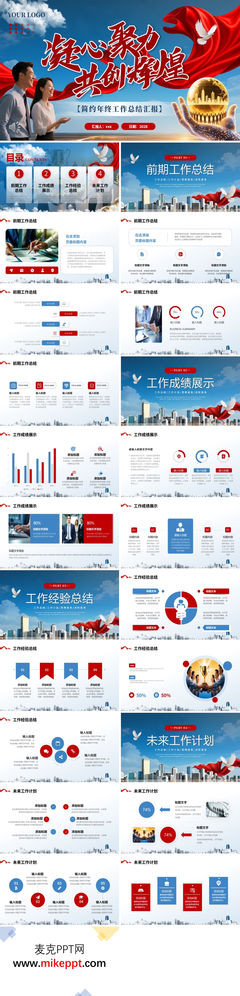這是一套圍繞“2026凝心聚力共創輝煌”主題的年終總結匯報 PPT,共包含 24 頁。它對企業過去一年的成就與目標進行全面回顧與梳理,意義重大。從員工個人層面來看,這份 PPT 能助力員工清晰了解自身一年來在工作中的成長軌跡,精準地認識到自身的優勢所在以及尚存的不足之處,進而促使員工有針對性地進行鞏固與改進,為后續工作筑牢根基,推動個人持續進步。從團隊與企業整體角度而言,通過呈現團隊協同工作的成果,能夠有效激發員工的創新思維,提升團隊整體的工作效率,增強團隊凝聚力,為企業未來的發展積蓄力量。 該 PPT 主體內容分為四大板塊。第一部分聚焦前期工作總結,開篇先對年初制定的工作計劃進行簡要介紹,讓觀眾明晰工作的藍圖與方向;隨后詳細呈現工作內容,將過去一年團隊在各項任務上的具體付出與努力完整展現;最后對工作目標的達成情況進行總結,對照計劃審視成果,為后續分析奠定基礎。第二部分著重于工作成績展示,全方位呈現成績,涵蓋員工個人成績,突出個體在專業技能、項目貢獻等方面的亮點;集體成績,凸顯團隊合作在項目推進、業務拓展等方面取得的成果;以及公司整體成績,如市場份額增長、品牌影響力提升等宏觀層面的成就,讓員工直觀感受到自身與團隊為公司發展所做出的重要貢獻。第三部分是工作經驗總結,一方面對過去一年的工作進行深度復盤,提煉成功經驗,分析失敗教訓,總結出可復制、可推廣的工作方法與模式;另一方面,基于過往經驗,對未來工作目標進行展望與介紹,明確下一步的發展方向與重點任務,使員工對未來的規劃有清晰認知。第四部分則是未來工作計劃,詳細闡述接下來一段時間內企業、團隊及個人的工作重點、目標分解以及實施步驟,為新一年的工作開啟新征程,引領全體員工朝著新的目標奮勇前行,攜手共創企業新的輝煌。