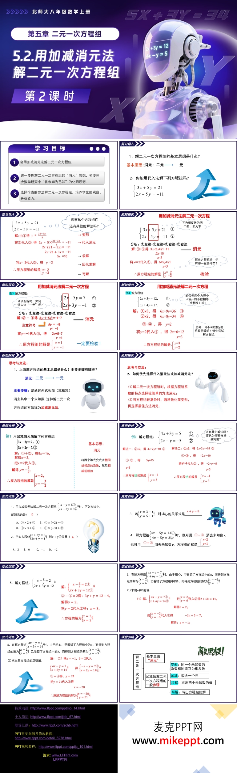 本套 PPT 課件是為北師大數學八年級上冊 5.2“二元一次方程組的解法(第 2 課時)”設計的教學資源,共包含 17 張幻燈片。本節課的核心目標是幫助學生在鞏固代入消元法的基礎上,進一步學習并掌握加減消元法解二元一次方程組的基本原理和步驟。通過本節課的學習,學生能夠根據方程組的特點靈活選擇合適的消元方法,從而提高解題效率。同時,課程通過實際問題的解決,讓學生感受到數學與生活的密切聯系,體會數學的應用價值,培養他們運用數學知識解決實際問題的意識。 在內容設計上,PPT 首先帶領學生回顧解二元一次方程組的基本思想以及代入消元法的解題步驟,幫助學生鞏固已學知識,為引入新的解法——加減消元法做好鋪墊。這種復習導入的方式能夠幫助學生更好地理解兩種消元法之間的聯系與區別,為后續學習奠定堅實基礎。 接著,PPT 通過具體問題引入加減消元法的概念。通過分析不同類型的方程組,引導學生理解加減消元法的基本原理:通過對方程組進行加減運算,消去其中一個變量,從而將二元問題轉化為一元問題求解。在講解過程中,PPT 結合實際問題,詳細展示了加減消元法的具體操作步驟,包括如何選擇合適的方程進行加減、如何調整方程系數以實現消元等關鍵環節。通過逐步分析和演示,學生能夠清晰地看到加減消元法的解題過程,從而掌握其核心技巧。 在教學過程中,PPT 通過典例分析,針對具體問題進行詳細剖析。每個例題都設計了詳細的解題思路和步驟,引導學生學會根據方程組的特點靈活選擇消元方法。例如,當方程組中某個變量的系數相等或互為相反數時,優先選擇加減消元法;而當方程組中某個方程較為簡單時,代入消元法則更為便捷。通過這種針對性的訓練,學生能夠逐步提高解決實際問題的能力,增強對兩種消元法的理解和應用。 為了鞏固學生對知識點的理解和應用,PPT 設計了鞏固練習和真題感知兩個環節。鞏固練習環節通過多樣化的題目設計,幫助學生進一步熟悉代入消元法和加減消元法的解題步驟,強化對知識的掌握。真題感知環節則通過引入歷年真題,讓學生提前感受考試題型,增強應試能力。通過這兩個環節的練習,學生不僅能夠加深對知識的理解,還能在實踐中提升自己的數學素養,為后續學習打下堅實的基礎。 總之,本套 PPT 課件通過系統的內容設計和豐富的教學方法,幫助學生全面掌握二元一次方程組的兩種主要解法——代入消元法和加減消元法。通過靈活運用這兩種方法,學生能夠根據方程組的特點選擇最優解法,提高解題效率。同時,通過實際問題的解決,學生能夠深刻感受到數學與生活的緊密聯系,激發他們運用數學知識解決實際問題的興趣和能力,為培養學生的數學思維和應用意識奠定堅實基礎。