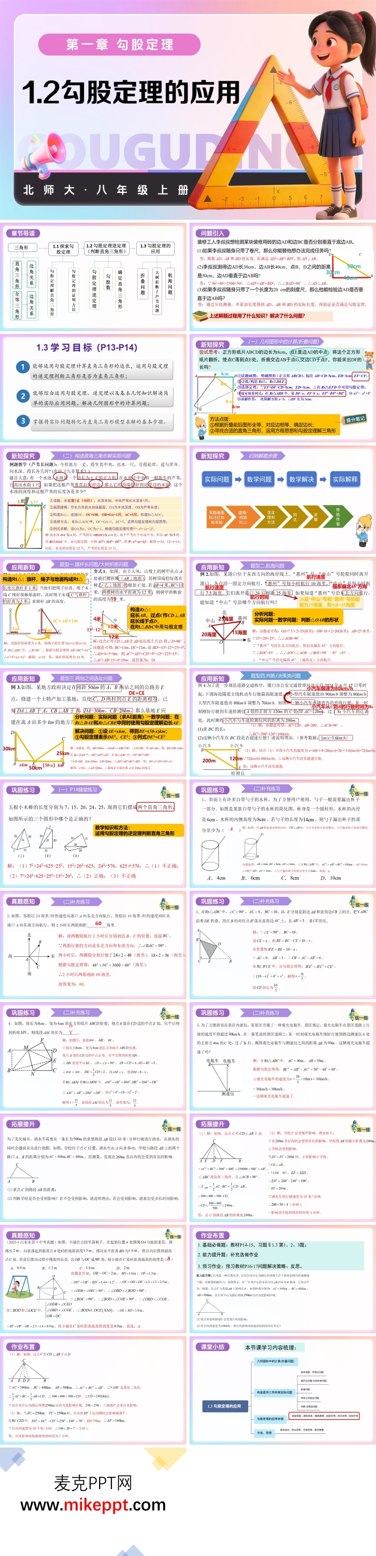 這份二十四頁的演示文稿,緊扣北師大2024版八年級上冊第一章《1.3 勾股定理的應用》,以“把定理搬到現場,讓斜邊開口說話”為立意,帶領學生在真實情境與幾何構造之間架起橋梁,完成“會算—會畫—會選”的三級跳。課堂依“情境—探究—鞏固—總結”四環推進: 開篇“問題引入”拋出裝修工人李叔叔的煩心事——一面矩形裝飾板需在對角線上精準開孔,手頭只有卷尺和筆,如何最快找到對角長度?視頻定格,學生脫口而出“用勾股定理”,生活需求瞬間轉化為數學任務;教師追問“若板長1米、寬0.6米,對角線多長?”學生口算得出√1.36≈1.17米,第一次體驗定理的“秒算”威力。 “新知探究”分三步走:先幾何計算——給定直角三角形兩邊求第三邊,強調“誰斜誰寫c”;再構造直角——把“斷裂的數軸”請上臺,學生在網格紙上以單位長度為直角邊,斜邊自然得到√2、√5等無理數,用圓規在數軸上截取而點,直觀看到“無理數也有家”;最后解決實際——把“折疊梯子靠墻面”“游船最短路徑”兩道真題拍成小動畫,學生獨立畫示意圖、標已知、設未知、列方程、求值,教師用顏色覆蓋功能對比不同解法,歸納“找直角—定斜邊—列平方和”三步解題模板。 “鞏固練習”分層推送:基礎層直接代入求第三邊;提高層在立體展開圖中找隱含直角;拓展層用逆定理判定直角后再算面積,平板實時呈現正確率,教師挑錯因現場“開刀”。 結課用“一句話接龍”——每人說一個今天見識到的定理新用途,彈幕滾成詞云;作業分兩層:A層教材習題夯實計算,B層拍攝家中“對角線”場景,測量驗證并錄成15秒短視頻,把課堂成果帶回生活。整套課件以真實任務驅動,以數軸構造拓展,以分層訓練落地,不僅讓學生熟練運用勾股定理解決長度、路徑、無理數定位等多類問題,更在“量一量、畫一畫、比一比”的親歷中,深化數形結合思想,為后續四邊形、圓及坐標幾何的學習奠定堅實的方法與信心基礎。