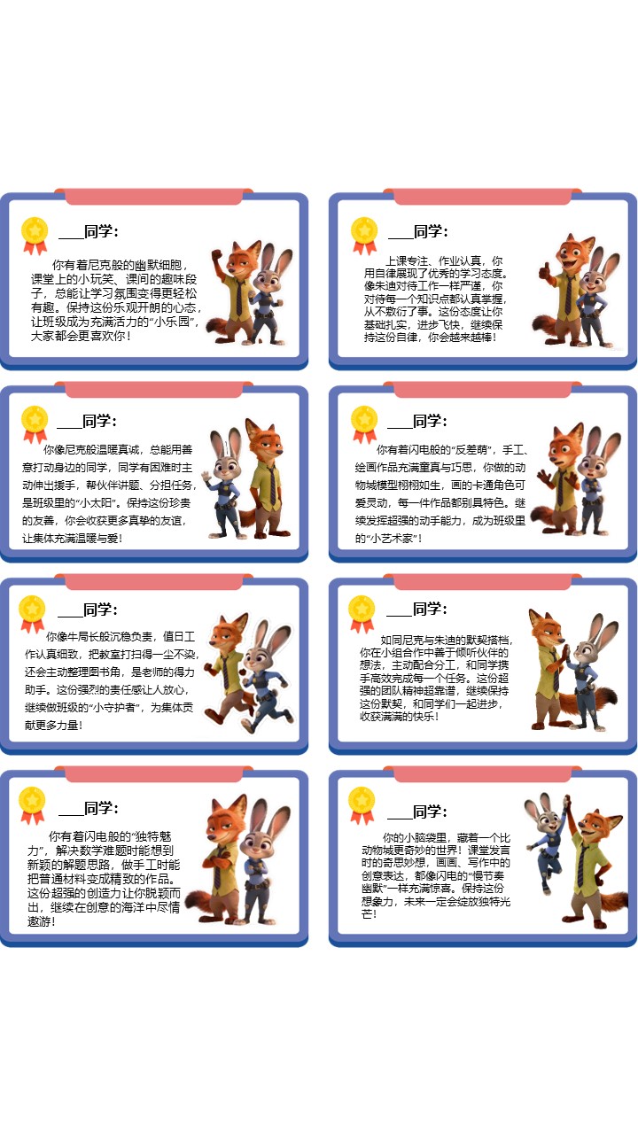 這是一套以《瘋狂動(dòng)物城》中尼克(狐貍)與朱迪(兔子)為形象的學(xué)生成長(zhǎng)激勵(lì)卡片,旨在以趣味化的方式為學(xué)生提供個(gè)性化表?yè)P(yáng)素材。卡片內(nèi)容圍繞學(xué)生的不同成長(zhǎng)表現(xiàn),精心設(shè)計(jì)了多組主題評(píng)價(jià)卡片,每張卡片都以尼克和朱迪的互動(dòng)畫(huà)面為配圖,搭配針對(duì)性的評(píng)語(yǔ),全面覆蓋學(xué)習(xí)、社交、習(xí)慣等多個(gè)成長(zhǎng)維度。例如,“合作互助” 卡片展現(xiàn)了尼克和朱迪攜手共進(jìn)的場(chǎng)景,鼓勵(lì)學(xué)生在團(tuán)隊(duì)中相互支持;“積極思考” 卡片則通過(guò)朱迪專注的神情,激勵(lì)學(xué)生勇于探索知識(shí);“勇敢嘗試” 卡片以尼克機(jī)敏的形象,引導(dǎo)學(xué)生突破自我,嘗試新事物。 評(píng)語(yǔ)風(fēng)格活潑親切,巧妙結(jié)合了動(dòng)畫(huà)角色的特質(zhì),如朱迪的執(zhí)著、尼克的機(jī)靈,讓表?yè)P(yáng)更加貼合學(xué)生的興趣,使學(xué)生在熟悉的動(dòng)畫(huà)情境中感受到自己的成長(zhǎng)亮點(diǎn)。整套 PPT 排版統(tǒng)一,采用藍(lán)色和黃色邊框巧妙區(qū)分不同卡片類型,畫(huà)面生動(dòng)且信息清晰,視覺(jué)效果極具吸引力。 這些卡片既可以作為課堂上的即時(shí)獎(jiǎng)勵(lì),及時(shí)給予學(xué)生肯定與鼓勵(lì),激發(fā)他們的學(xué)習(xí)熱情;也能作為學(xué)生成長(zhǎng)檔案中的個(gè)性化寄語(yǔ),記錄學(xué)生成長(zhǎng)的點(diǎn)滴。它不僅為老師提供了豐富且實(shí)用的鼓勵(lì)工具,還借助學(xué)生喜愛(ài)的動(dòng)畫(huà)形象為載體,傳遞正向引導(dǎo)。通過(guò)這種方式,學(xué)生能夠更直觀地感知自身優(yōu)點(diǎn),激發(fā)內(nèi)在成長(zhǎng)動(dòng)力,從而在學(xué)習(xí)和生活中不斷進(jìn)步,收獲自信與快樂(lè)。