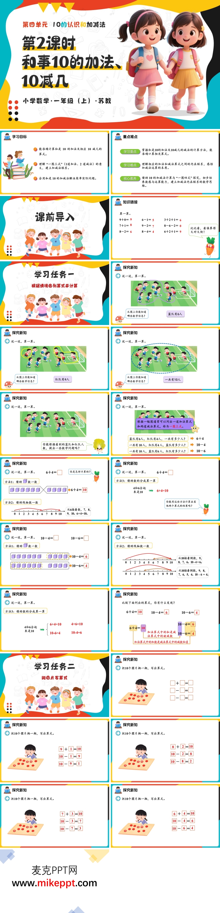 這份蘇教版一年級上冊第四單元第2課時課件,以“和是10的加法與10減幾”為核心,沿著“情境激趣—操作探究—系統(tǒng)梳理—應用鞏固”的脈絡,引導學生在真實場景與動手活動中掌握10的加減全貌,感悟加減互逆的本質。課前導入用“口算小火車”動畫,學生搶答10以內加減,迅速喚醒舊知,營造積極氛圍。 新知環(huán)節(jié)以“足球比賽”切入:藍隊6人、紅隊4人,屏幕先呈現(xiàn)賽場照片,再彈出“一共有多少球員?”學生脫口而出6+4=10;教師追問“若知道總數10人和紅隊4人,怎樣求藍隊?”順勢生成10-4=6,再追問“若知道藍隊6人,怎樣求紅隊?”又得10-6=4,同一幅情境圖衍生三式,板書用紅、藍、綠三色區(qū)分,學生直觀看到“加合求總,減總求部”,加減互逆關系一目了然。 為突破算法單一性,課件提供“擺小棒—數數軸—想分合”三種路徑:①擺小棒:先擺6根,再添4根,合成一捆;②數數軸:從6出發(fā)向右跳4格到10;③想分合:背誦“6和4組成10”,多種方法并列呈現(xiàn),尊重不同思維層次。 “拋圓片活動”把課堂推向高潮:學生兩人一組拋10個雙色圓片,記錄正面、反面數量,即時填寫算式(9+1=10、10-1=9等),教師匯總生成“和是10加減表”,全班齊讀,系統(tǒng)梳理所有組合,強化記憶。 鞏固練習分三層:①基礎口算“開火車”——教師隨機指分合圖,學生搶答對應加減;②看圖寫三式——同一幅小棒圖寫出加、減兩式;③生活應用——“我有10元,買筆花3元,剩幾元?”口頭列式,體驗數學與日常連接。 課堂小結用兒歌收束:“6加4,10個足;10減4,6剩余;一圖三式記心間,加減互逆不分離?!睂W生邊拍手邊背誦,把核心算法與算理唱進腦海。課后延伸讓學生回家與家長玩“拋硬幣湊10”游戲,記錄5組數據并寫算式,把課堂體驗遷移到家庭。 整份課件以“同一情境生成三式—多種算法并行—系統(tǒng)梳理組合—生活應用拓展”四連擊,讓和是10的加減法從具體情境走向符號運算,再回歸生活應用,既夯實口算基本功,又初步滲透互逆與函數思想,為后續(xù)20以內進位加和退位減奠定扎實而生動的基礎。