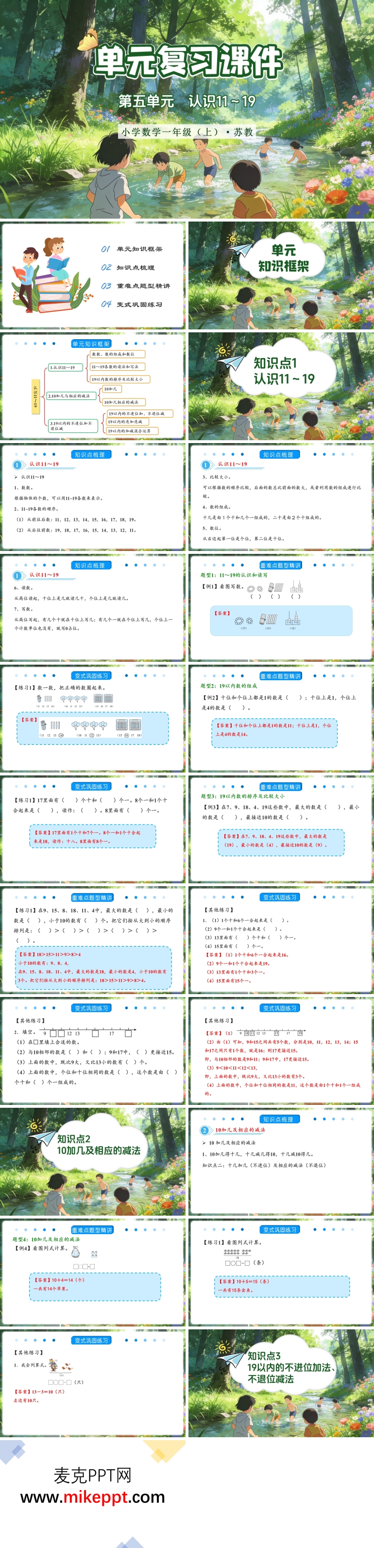 這份蘇教版一年級(jí)上冊(cè)第五單元復(fù)習(xí)課件以“知識(shí)框架—逐點(diǎn)梳理—題型精講—變式訓(xùn)練”四步推進(jìn),將11~19數(shù)的認(rèn)識(shí)與運(yùn)算內(nèi)容系統(tǒng)整合,為學(xué)生打造清晰高效的復(fù)習(xí)路徑。開(kāi)篇“單元知識(shí)框架”用思維導(dǎo)圖一目了然地呈現(xiàn)三大板塊:①11~19的認(rèn)識(shí)(讀寫(xiě)、順序、組成、數(shù)位);②10加幾及相應(yīng)減法(得十幾、還原10);③19以內(nèi)不進(jìn)位加、不退位減(相同數(shù)位相加減),讓學(xué)生對(duì)復(fù)習(xí)范圍心中有數(shù)。 “認(rèn)識(shí)11~19”部分先用動(dòng)態(tài)小棒演示:1捆十根加幾根單根,同步顯示計(jì)數(shù)器十位、個(gè)位珠子的變化,幫助孩子再次體會(huì)“1個(gè)十和幾個(gè)一”的組成;接著用數(shù)軸拖拽游戲練習(xí)從小到大排序,強(qiáng)化數(shù)序;讀寫(xiě)環(huán)節(jié)則通過(guò)“數(shù)字—漢字—小棒圖”三角對(duì)應(yīng),加深數(shù)位印象。 “10加幾及相應(yīng)減法”用“接著數(shù)”和“還原法”雙向展開(kāi):屏幕先出現(xiàn)10個(gè)蘋(píng)果,再逐一增加,學(xué)生口算10+3=13;逆向從13個(gè)蘋(píng)果拿走3個(gè),回到10個(gè),理解13-3=10,動(dòng)畫(huà)同步呈現(xiàn)算式,突出加減互逆。 “19以內(nèi)不進(jìn)位加、不退位減”用對(duì)比式板書(shū):15+2=17,先算個(gè)位5+2=7,十位不變;17-2=15,先算個(gè)位7-2=5,十位不變,強(qiáng)調(diào)“相同數(shù)位才能直接相加減”的算理,并用顏色區(qū)分十位、個(gè)位,避免錯(cuò)位。 “重難點(diǎn)題型精講”精選三大易錯(cuò)點(diǎn):①讀寫(xiě)漏寫(xiě)十位“1”;②比較大小只看個(gè)位;③減法忘記先減個(gè)位。每題先出示錯(cuò)例讓學(xué)生找茬,再展示正解并配“錯(cuò)因警示燈”,加深印象。 “變式鞏固練習(xí)”設(shè)置“看圖寫(xiě)數(shù)—填空湊十—排序比大小—加減口算”游戲闖關(guān),系統(tǒng)即時(shí)反饋正確率,教師依據(jù)數(shù)據(jù)現(xiàn)場(chǎng)講評(píng),確保人人過(guò)關(guān)。 整份課件用“框架總覽—?jiǎng)赢?huà)演示—錯(cuò)例找茬—游戲闖關(guān)”四連擊,讓11~19的讀寫(xiě)、組成、排序、加減運(yùn)算形成一條清晰的知識(shí)鏈,既夯實(shí)數(shù)感,又提升計(jì)算與問(wèn)題解決能力,為一年級(jí)期末復(fù)習(xí)提供了高效、有趣、貼合認(rèn)知的系統(tǒng)方案。