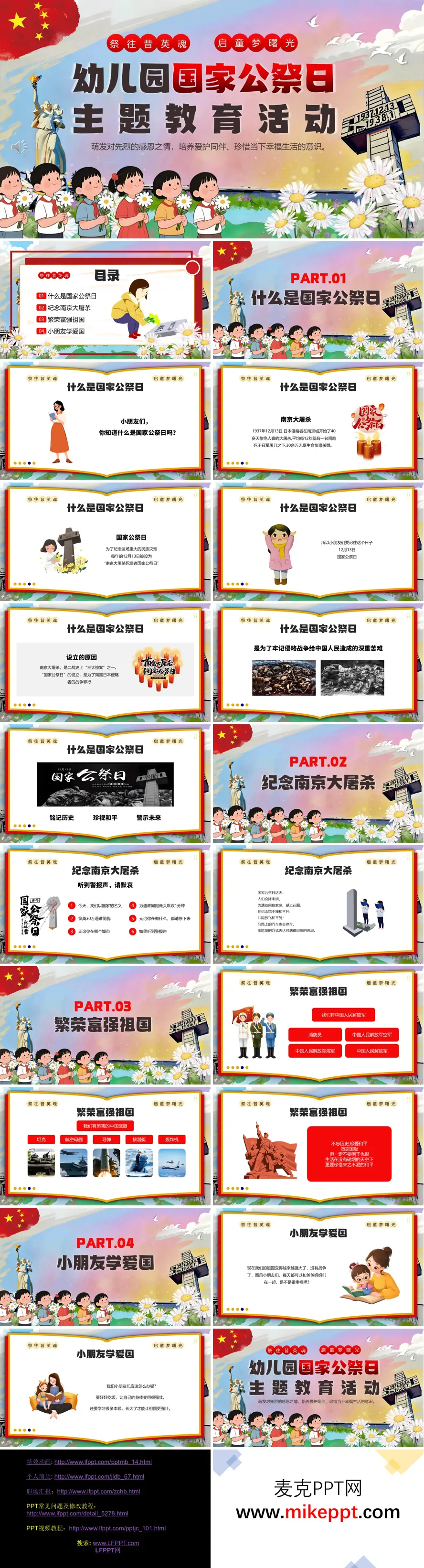 這套PPT是一份面向幼兒園兒童的國家公祭日主題教育活動方案,主題為“祭往昔英魂,啟童夢曙光”。其內容設計充分考慮了幼兒的理解能力,旨在以溫和、形象的方式萌發孩子們的感恩之情,而非渲染恐懼。 PPT首先通過設問“什么是國家公祭日”引入,用簡明的語言和象征性圖片(如鐘、日歷)解釋了12月13日這個日子的由來,強調是為了“銘記歷史、珍視和平”。接著,通過介紹降半旗、默哀、鳴笛等公祭儀式,讓孩子們感知莊重的紀念氛圍。然后,話鋒一轉,通過展示解放軍、航空母艦等現代國防力量,將話題引向“繁榮富強的祖國”,給予孩子們安全感。最后,落腳于“小朋友學愛國”,引導孩子們將愛國情感轉化為“好好吃飯、強壯身體、學習本領”等具體行動,并懂得珍惜當下的幸福生活。 整體上,該文檔結構清晰,由歷史到現實,由緬懷到勵志,成功地將沉重的歷史主題轉化為一場富有教育意義和積極導向的生命啟蒙課。