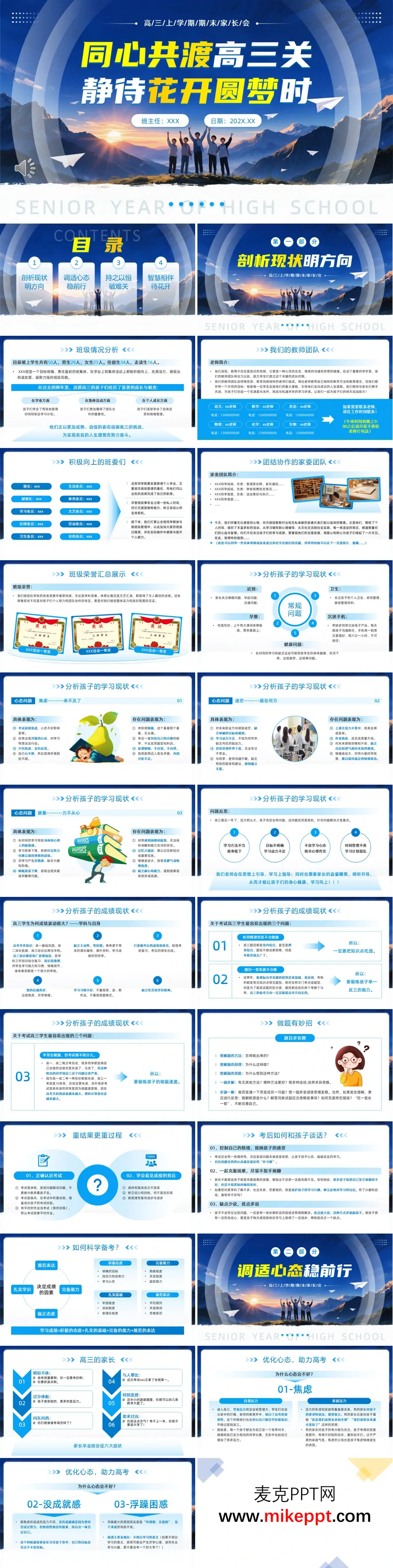 這是一份高三上學期期末家長會演示文稿,主題為"同心共渡高三關(guān),靜待花開圓夢時"。內(nèi)容分為四個核心板塊:首先剖析班級現(xiàn)狀,指出學生普遍存在焦慮、迷茫、疲憊三大心態(tài)問題,以及成績波動源于知識綜合難度增大、學習習慣不佳等因素;其次強調(diào)家長心態(tài)調(diào)適,提出營造溫馨家庭氛圍、避免嘮叨攀比等"六大癥狀",給出均衡營養(yǎng)配餐建議和情緒疏導方法;第三聚焦堅持策略,倡導樹立正確認知、提升學習效率、注重勞逸結(jié)合、鼓勵及時復盤;最后提出家校協(xié)作方案,主張家長"舍得"投入時間、保持一致節(jié)奏、抓好"高三墻"和"責任區(qū)"兩個抓手。整體旨在構(gòu)建家校共育體系,通過科學備考指導與心理支持,助力學生平穩(wěn)度過高三關(guān)鍵期。