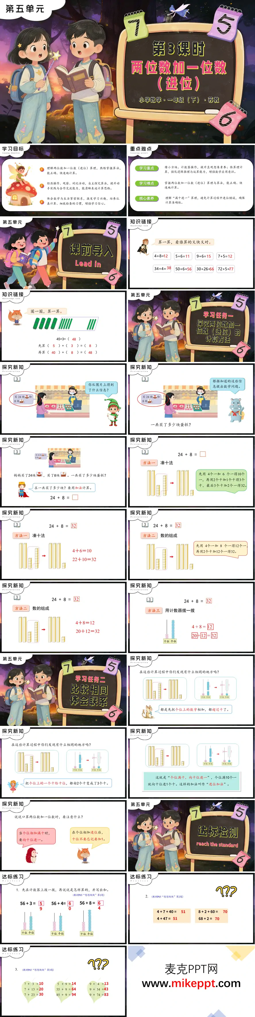 本套 PPT 是蘇教版一年級下冊第五單元第 3 課時 “兩位數加一位數(進位)” 的教學內容,主要聚焦于進位加法的算理與算法。其學習目標是讓學生理解兩位數加一位數(進位)的算理,掌握正確的計算方法并能夠準確計算,同時培養學生的操作探究能力和知識應用能力。課程的重難點在于幫助學生理解 “滿十進一” 的規則,掌握進位加法的計算方法,避免在計算過程中出現錯誤。 在內容安排上,課前導入環節先復習不退位加法和一位數進位加法,幫助學生鞏固已學知識,再通過 “買彩紙” 的生活情境引出具體的進位加法問題——24+8。這種情境化的導入方式能夠激發學生的學習興趣,使他們更自然地進入新課的學習。 學習任務一以 24+8 為例,通過湊十法、數的組成和計數器撥數三種方法,逐步引導學生推導出 “個位相加滿十,向十位進 1” 的進位規則。這三種方法從不同角度幫助學生理解進位加法的算理,使學生能夠更直觀地感受到進位過程,同時培養學生的動手操作能力和自主探究能力。 學習任務二通過對比不退位加法與進位加法的區別,明確進位加法的適用條件。這種對比教學方式幫助學生清晰地認識到兩種加法在計算過程中的不同點,進一步加深對進位加法算理的理解,避免混淆。 在鞏固練習環節,設計了多種類型的題目,包括計數器操作、混合運算、規律計算以及實際應用題(如收集礦泉水瓶、果樹數量統計等)。這些練習題不僅幫助學生鞏固所學知識,還強化了學生將數學知識應用于實際生活的能力,使學生能夠在不同情境中靈活運用進位加法。 最后,總結評價板塊對本課的核心算理進行了梳理,幫助學生回顧和總結所學內容。同時,配套的自我評價和小組互評環節鼓勵學生反思自己的學習過程,分享學習經驗,從而更好地內化知識。 這套 PPT 通過清晰的學習目標、多樣化的教學方法、豐富的練習設計以及系統的總結評價,為學生提供了一個全面且有效的學習框架。它幫助學生在輕松愉快的氛圍中掌握兩位數加一位數(進位)的計算方法,提升數學思維能力和解決實際問題的能力,為后續的數學學習奠定堅實基礎。