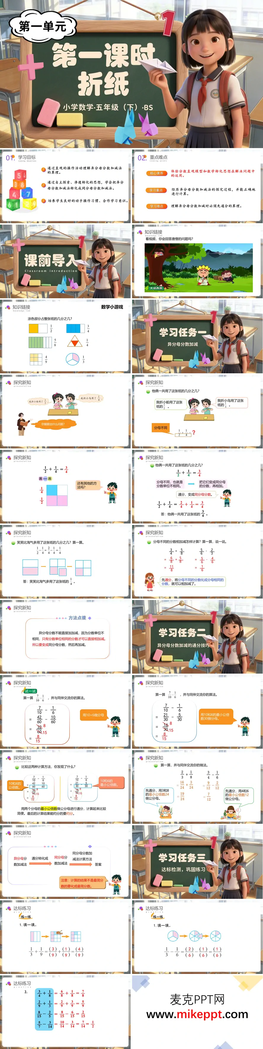 這份五年級下冊“異分母分數加減法”課件以“折紙”情境貫穿始終,遵循“沖突—轉化—優化—應用”四步,引導學生在動手與合作中理解“分數單位不同需通分”的算理,掌握“先同分再加減”的算法。導入環節播放“創意折紙”短片:小紅用1/2張彩紙折鶴,小明用1/4張折船,兩人共用多少張?學生自然列出1/2+1/4,卻發現“半張+四分之一張”無法直接相加,認知沖突瞬間點燃探究欲望。 轉化思想用“折紙+動畫”雙通道:屏幕把1/2和1/4分別折成2/4和1/4,拼成3/4,學生直觀看到“分數單位統一后才能相加”;教師再對比普通公倍數與最小公倍數通分,用“彩色分數條”演示:用4作公分母需2步,用2作公分母只需1步,順勢提煉“最小公倍數最簡”的優化策略,并用“先擴分、再加減、后約分”三步驟規范書寫。 達標練習5道題層層遞進:①填空——補通分過程;②計算——含結果約分;③改錯——找出通分錯誤并訂正;④解方程——異分母分數方程;⑤生活應用——“果汁混合1/3+1/6”期末真題,系統實時批改并生成“錯因云圖”,教師針對“公分母選大”“結果未約分”再示范,確保算理清晰。 總結用“三句話”口訣收束:單位不同先通分,最小公倍最簡便,結果要約到最簡;自我評價從“我懂算理、我會通分、我肯檢查”三面點贊,小組互評貼星星,讓知識、情感雙提升。 整份課件用“折紙沖突—動畫轉化—對比優化—生活應用”四連擊,把異分母加減從“機械通分”升級為“單位統一+策略優化”,既突破“正確通分”難點,又培養轉化與簡算意識,為后續分數混合運算、解決問題奠定堅實而有趣的基礎。
