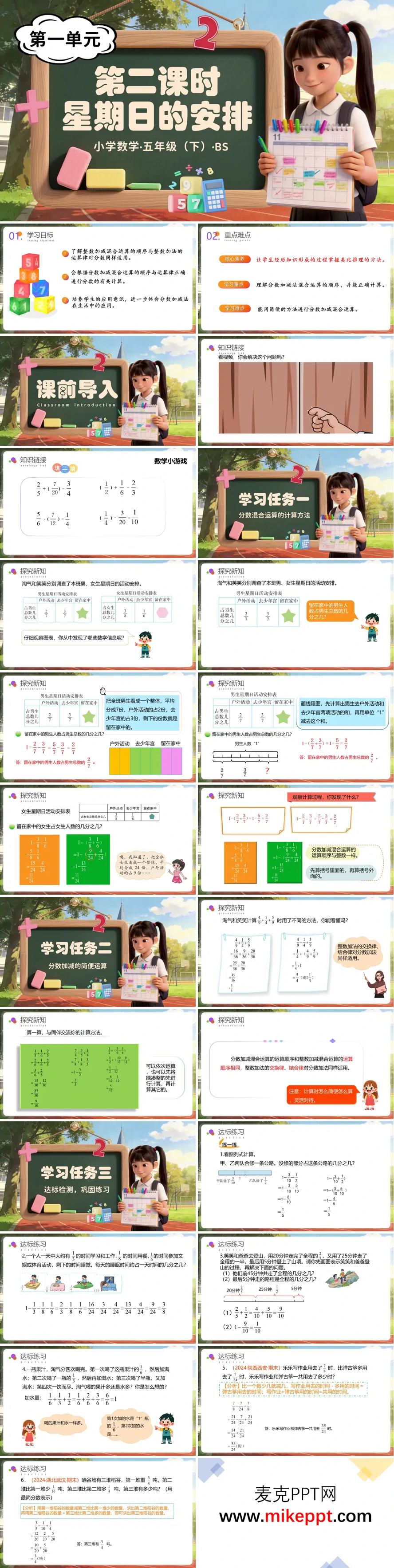 這份五年級下冊“分數加減混合運算”課件以“星期日的安排”為主線,將計算教學融入真實生活場景,引導學生在解決“留在家時間占比”的過程中,自然掌握分數混合運算的順序與簡便策略。導入環節呈現男女生活動統計表:外出游玩占2/7,參加興趣班占1/7,留在家占多少?學生先列1-2/7-1/7,再列1-(2/7+1/7),兩種算法對比后,教師用顏色條形圖動態演示:依次相減與先算括號結果相同,順勢板書“分數混合運算順序和整數完全一樣”,并配口訣“有括號先括號,無括號從左到右”。 簡便運算用“湊整動畫”:1/4+3/8+3/4,先交換1/4與3/4湊1,再加3/8,學生看到“湊整后口算即可”,教師強調“交換律、結合律對分數同樣適用”,并用“先找同分母,再湊整,后計算”三步驟規范書寫。 達標練習6道題層層遞進:①看圖列式——根據活動時間條寫混合算式;②修路——已修、再修、剩余三段占比;③睡眠時間——先求和再求差;④登山——上坡、下坡、平路時間分配;⑤喝果汁——先喝1/3,再喝1/4,剩余多少;⑥期末真題——含括號與湊整綜合,系統實時批改并生成“錯因云圖”,教師針對“括號漏算”“湊整后忘加剩余”再示范,確保運算順序落地。 總結用“一張思維導圖”收束:順序—括號—湊整—應用,學生用便利貼寫下最易錯點貼于展板,形成班級“混合運算警示墻”;自我評價從“我懂順序、我會湊整、我肯檢查”三面點贊,小組互評貼星星,讓知識、情感雙提升。 整份課件用“生活情境—算法對比—湊整優化—梯度應用”四連擊,把分數混合運算從“機械套順序”升級為“會找整、會簡算”的策略技能,既突破“正確計算”難點,又培養應用與類比推理能力,為后續分數乘除混合、解決問題奠定堅實而有趣的基礎。